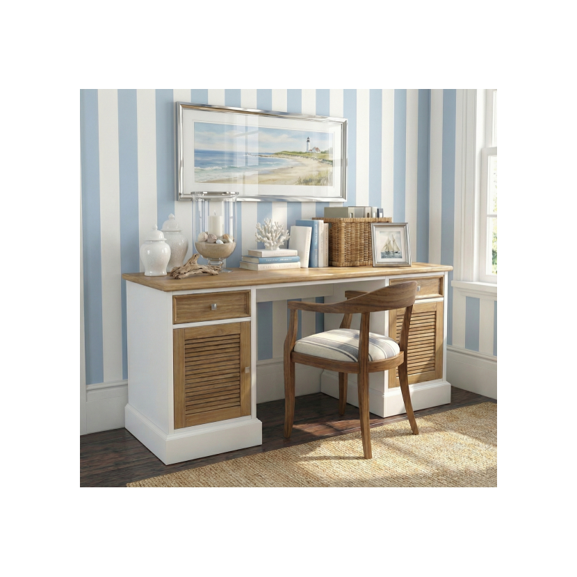 Dębowe fronty żaluzjowe: Charakterystyczne drzwiczki typu „shutter” nadają biurku unikalny, kolonialny sznyt. Wykonanie ich z dębu tworzy spójną kompozycję z blatem i pięknie kontrastuje z białym korpusem.