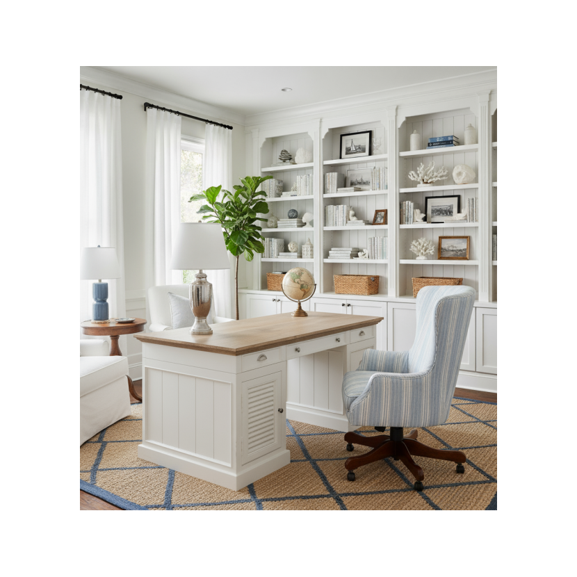 Fronty żaluzjowe (Shutters): Charakterystyczne drzwiczki typu żaluzja nadają biurku lekkości i unikalnego sznytu, kojarzonego z luksusowymi meblami w stylu coastal.