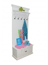 Pięć wieszaków, które pomieszczą dużą liczbę nie tylko płaszczy i nakryć, ale również szali i chust. Pojemny blat daje możliwość przechowywania innych rzeczy, ale nie tylko. Możemy na nim położyć poduszki, a stanie się ławeczką, na którą zasiądą wszyscy, którzy chcą ściągnąć buty. To bardzo proste rozwiązanie, które ułatwia zagospodarowanie szczególnie mniejszych przedpokoi, w których brakuje miejsca na krzesło. Wyrzeźbione drzwiczki, które kryją za sobą miejsce dla butów. Półka, która kryje się w zwieńczeniach to dodatkowa przestrzeń na wszystkie nasze rzeczy.