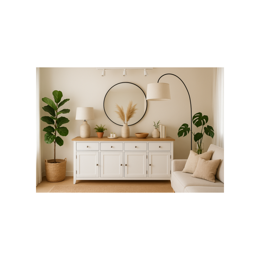 Wskazówka: Tak szeroka komoda doskonale równoważy duże przestrzenie. Jeśli masz długą, pustą ścianę, ten model wypełni ją w sposób szlachetny i uporządkowany, bez przytłoczenia wnętrza dzięki jasnej kolorystyce.
