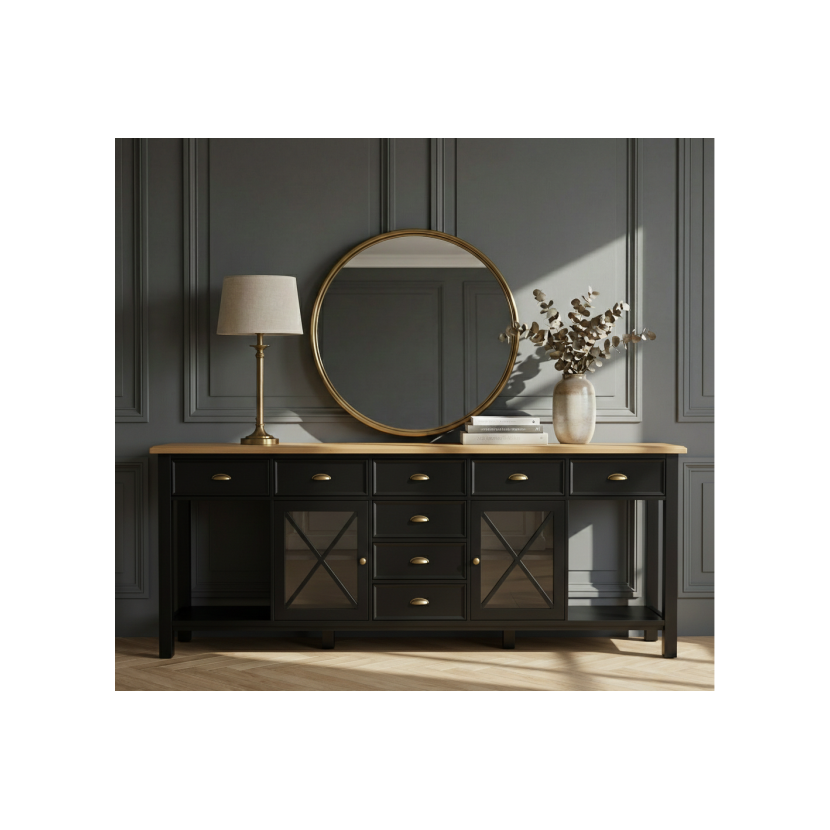 Jeśli szukasz mebla, który zdefiniuje charakter Twojego salonu lub jadalni, Komoda Bolonia o imponującej szerokości 240 cm jest wyborem bezkompromisowym. To luksusowe połączenie głębokiej, matowej czerni z ciepłem naturalnego drewna, które wpisuje się w najnowocześniejsze trendy stylu modern classic oraz nowojorskiego loftu.
