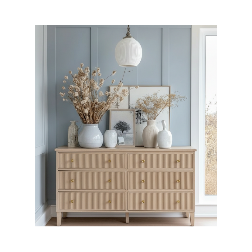 "Ryflowany dąb to jeden z najsilniejszych trendów wnętrzarskich ostatnich lat. Komoda ta idealnie łączy surowość naturalnego materiału z wyrafinowaną formą, sprawdzając się w aranżacjach japandi, nowoczesnych oraz skandynawskich."