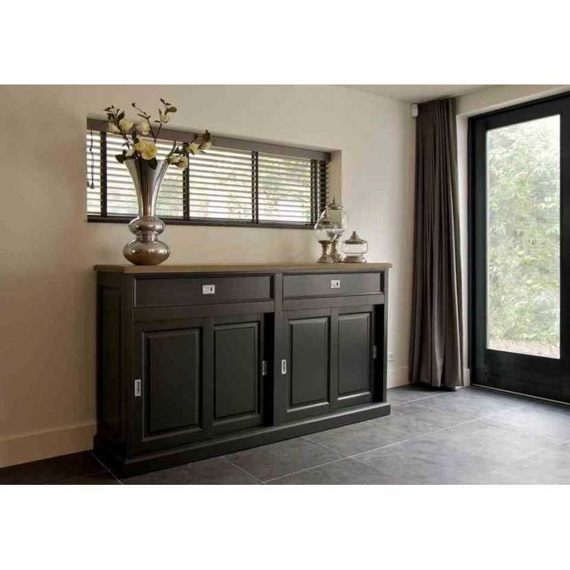 Przesuwne drzwi sprawiają, że komoda jest ekspresyjna w odbiorze. Fronty przepięknie podkreślają cały wygląd mebla, a nowoczesne uchwyty dodają świeżości. Drewniany blat w innym odcieniu to piękna przestrzeń na elementy dekoracyjne. Złote wazony, bogato zdobione świeczniki? A może po prostu świeże kwiaty i rośliny? Co chcielibyśmy postawić na nim, aby nasze wnętrze było jeszcze bardziej spersonalizowane i gustowne?