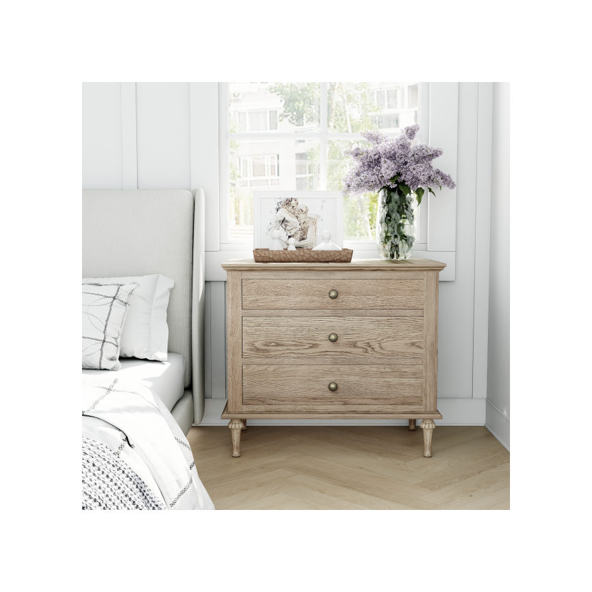 Dębowa komoda Polina wyposażona w praktyczne szuflady pod blatem oraz ozdobne, toczone nogi. Drewniana szafka Polina to luksus, tradycyjność i niezwykle naturalne piękno. Barwa oraz usłojenie sprawią, że jest to mebel unikatowy. Szuflady wpływają na funkcjonalność mebla. To piękny model zarówno do wnętrz w stylu klasycznym, jaki i do aranżacji w stylu rustykalnym, wzbogaconych kolorowymi tkaninami i koszami z wikliny.