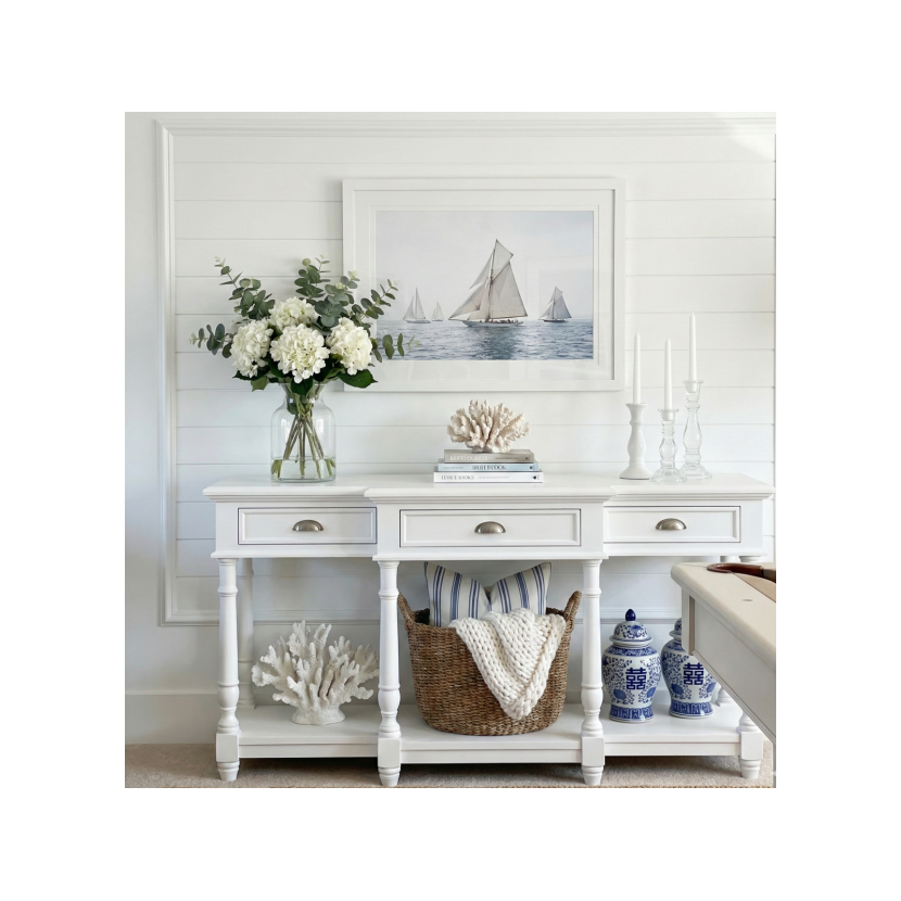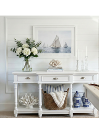 Przemień swój przedpokój lub salon w przestrzeń pełną światła i harmonii. Biała konsola Faro to kwintesencja luksusowego stylu coastal living, który łączy nadmorską swobodę z klasycznym szykiem. Ten starannie zaprojektowany mebel o szerokości 160 cm to idealna propozycja dla osób poszukujących wysokiej jakości elementów wyposażenia w stylistyce Hamptons oraz Modern Classic.