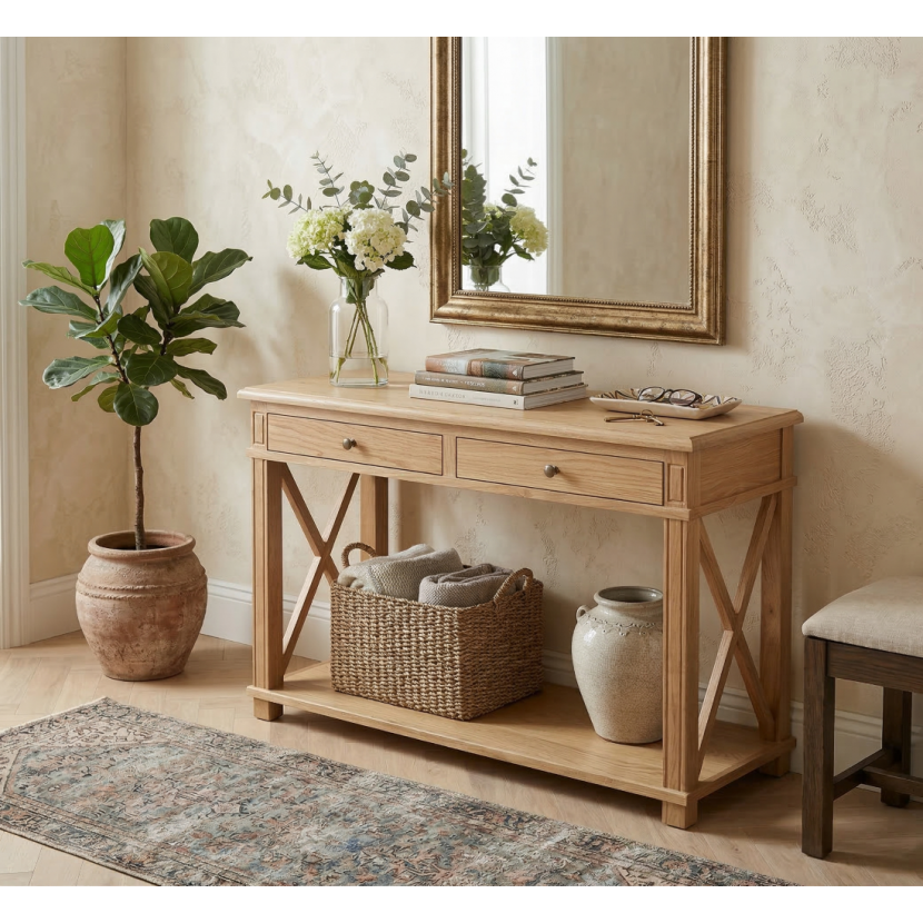 Konsola Konstancja na dole posiada półkę, która zmieści nie tylko ozdoby, ale także inne rzeczy, na które być może brakuje nam miejsca. Krzyżowe boki to element dekoracyjny, który podkreśla wykwintny charakter całej konstrukcji. Dwie pojemne szuflady to miejsce na nasze drobiazgi. Na drewnianym blacie przepięknie będą prezentowały się wazony ze świeżymi kwiatami, ramki ze zdjęciami i pamiątki rodzinne. Może szukamy mebla, na którym chcielibyśmy postawić lampę? Konstancja oferuje przestrzeń również na oświetlenie.