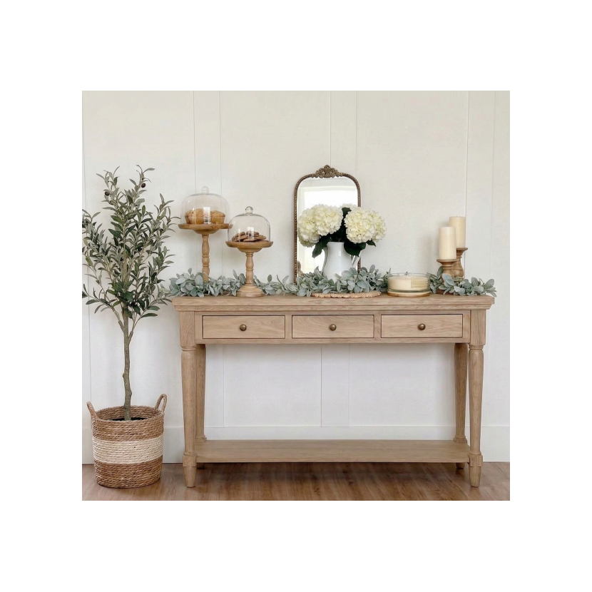 Dąb to surowiec, który sam w sobie jest niezwykle okazały. Wszystkie meble, które wykonane są z niego, również mają w sobie coś, co przyciąga. Oprócz tego cechuje go wytrzymałość i trwałość. Właśnie taka jest konsola Herman, ale to jeszcze nie wszystko, co ma do zaoferowania. Projektując ten mebel chcieliśmy połączyć klasykę z nietuzinkową formą. To właśnie dlatego konsola stoi na cienkich, własnoręcznie rzeźbionych nogach. Na dole widzimy dodatkową półkę na nasze rzeczy oraz dekoracje. Konsola posiada trzy pojemne szuflady, w których możemy schować świece lub ozdoby, aby sprawnie je zmieniać. Blat daje przestrzeń na oświetlenia, pamiątki rodzinne i wszystko to, co chcielibyśmy na nim umieścić. Mamy tutaj całkowitą swobodę w aranżacji konsoli, ponieważ jej naturalny koloryt jest uniwersalny i podkreśli piękno każdej rzeczy.