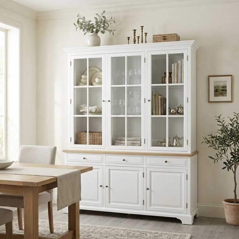 Witryna została utrzymana w odcieniu szlachetnej bieli, która optycznie powiększa i rozświetla pomieszczenie. Wyjątkowego charakteru dodaje jej blat wykonany z naturalnego dębu, eksponujący piękne usłojenie drewna. To zestawienie kolorystyczne idealnie wpisuje się w styl prowansalski, rustykalny, a także klasyczny skandynawski.