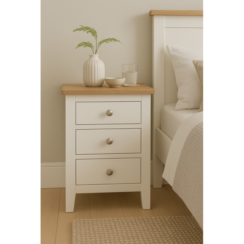 Dopełnij aranżację swojej sypialni dzięki szafce nocnej z serii Skandiline. Ten stylowy stolik nocny łączy w sobie nieskazitelną biel matowego korpusu z solidnym, dębowym blatem. Dzięki kompaktowym wymiarom i aż trzem szufladom, jest to jeden z najbardziej praktycznych mebli w swojej kategorii, oferujący znacznie więcej miejsca niż standardowe stoliki nocne.