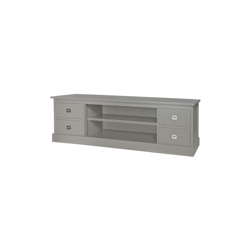 Klasyczna komoda RTV ma miejsce na telewizor, pojemne szafki. Podstawa, która zapewnia stabilność i niezwykłą trwałość mebla. Delikatne boczne frezowanie dodają gustowności, natomiast prosty blat podkreśla klasyczny charakter szafki. Na największą uwagę zasługują półki oraz cztery pojemne szuflady. Taki designerski zabieg jest odpowiedzią na potrzeby miłośników kreatywnych rozwiązań.