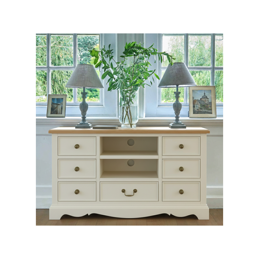 7 Praktycznych Szuflad: Wyjątkowy układ szuflad (6 bocznych z gałkami oraz 1 szeroka centralna z uchwytem typu muszla) pozwala na wygodne przechowywanie kolekcji płyt, kabli, pilotów czy gier.