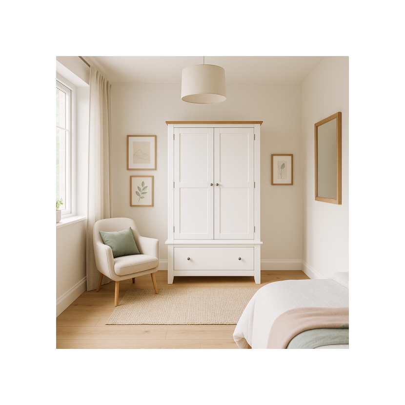 Szukasz kompaktowej szafy, która zachwyca designem i oferuje maksimum funkcjonalności? Szafa Skandiline o szerokości 110 cm to esencja stylu skandynawskiego zamknięta w smukłej formie. Połączenie matowej bieli z eleganckim dębowym wieńcem sprawia, że mebel ten doskonale rozświetla wnętrze, dodając mu przytulnego, naturalnego charakteru.
