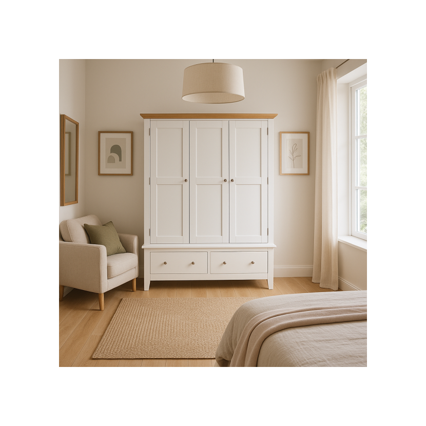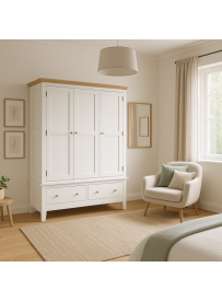 Szafa Skandiline to inwestycja na lata. Wykonana z wysokiej jakości materiałów, charakteryzuje się solidną konstrukcją i dbałością o detale. Srebrne gałki dodają subtelnego blasku, a frezowane fronty podkreślają rzemieślniczy charakter mebla. Naturalny odcień dębowego wieńca przełamuje surowość bieli, wprowadzając do sypialni przytulną atmosferę.
