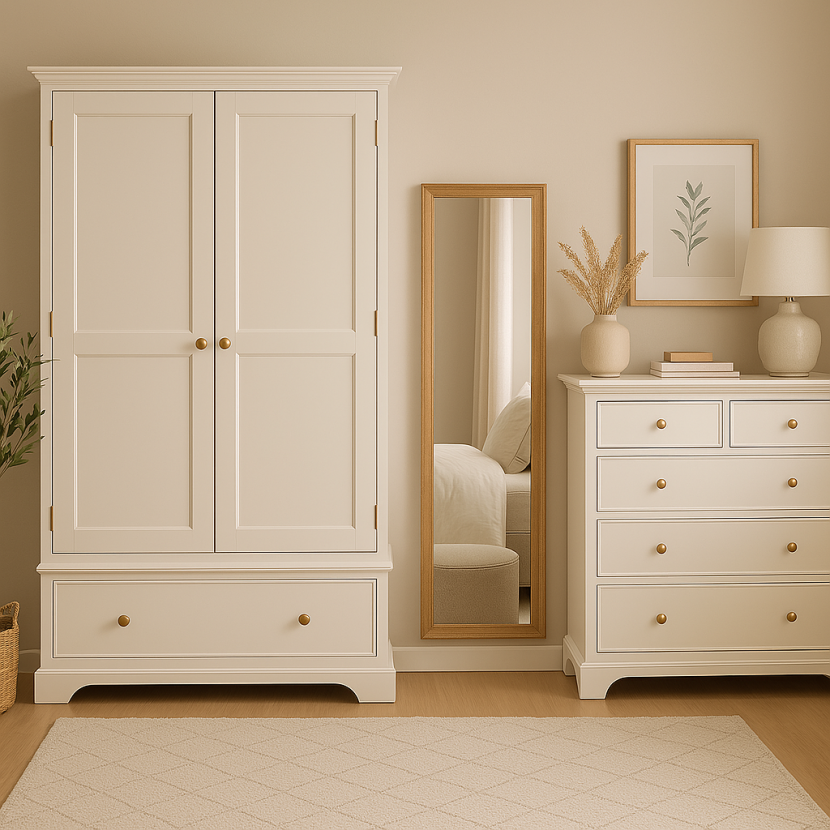 Szukasz praktycznej i stylowej szafy do sypialni? Ten model łączy klasyczną elegancję z nowoczesnym komfortem przechowywania. Dwudrzwiowa szafa z dużą dolną szufladą zapewnia funkcjonalną przestrzeń na odzież, dodatki i tekstylia, a jej biały kolor i złote uchwyty sprawiają, że idealnie wpasowuje się w jasne, przytulne wnętrza.