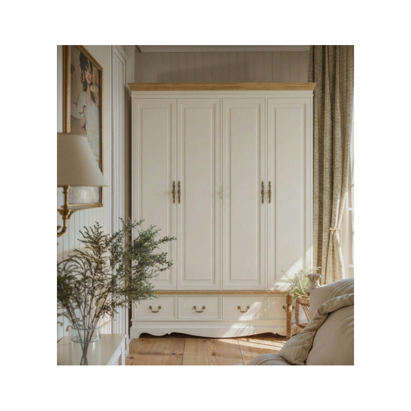 Czterodrzwiowa strefa główna: Wysokie fronty z klasycznymi płycinami kryją przestronne wnętrze na ubrania wiszące oraz półki.
